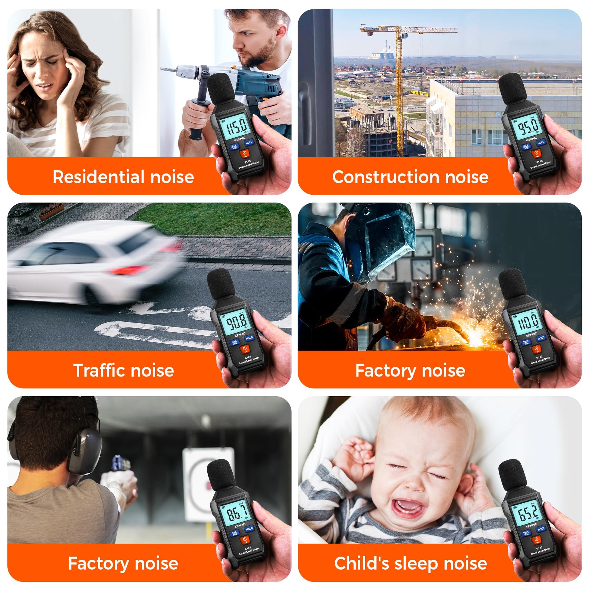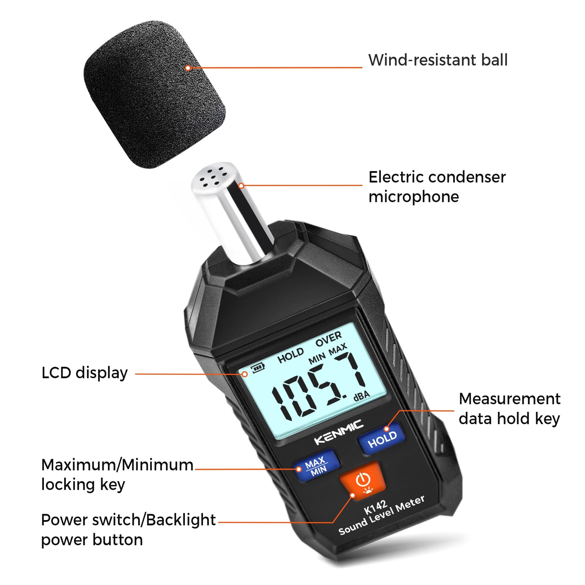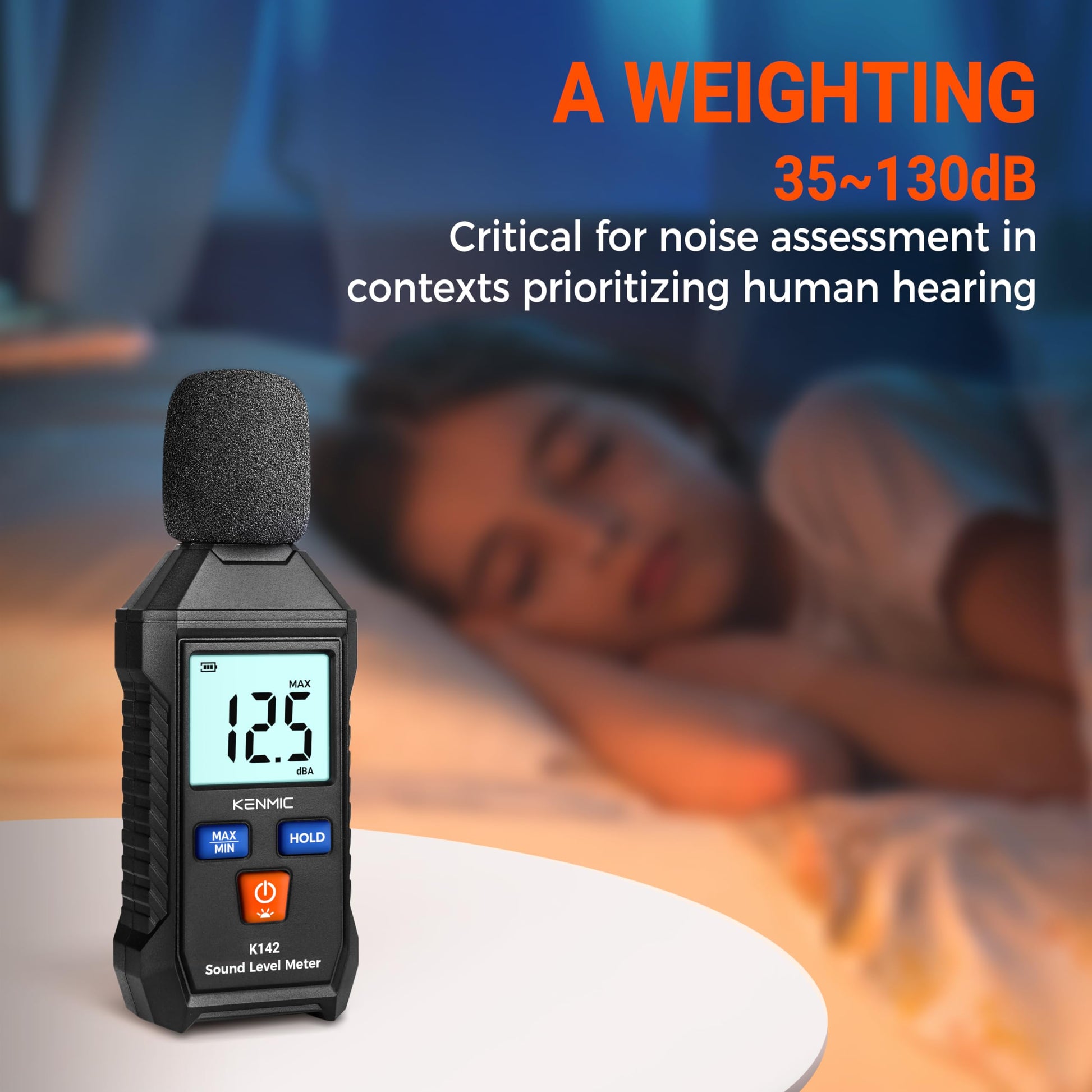 KENMIC K142-Digital Decibel Meter - Portable SPL Meter with Backlit LCD Display (35-130dB(A) Range)