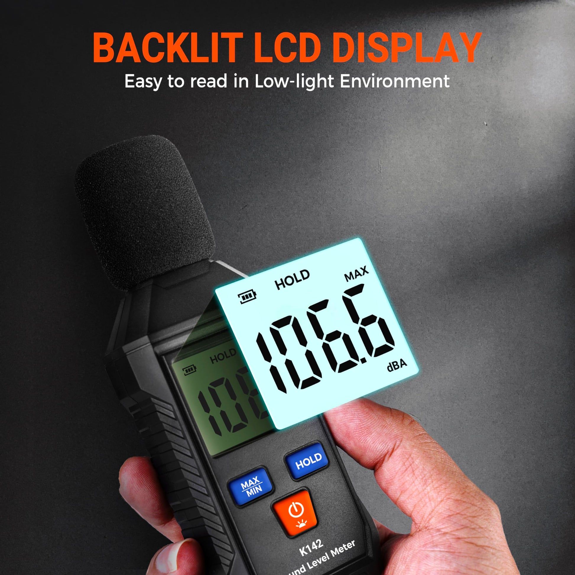 - LCD SCREEN WITH BACKLIGHT - The K142 sound level meter displays noise levels in decibels (dB) on a large LCD screen for easy readability. A momentary press of the backlight power button activates the backlight, ensuring visibility even in low-light conditions. When the battery is running low, a low voltage icon appears on the LCD, indicating the need for battery replacement.