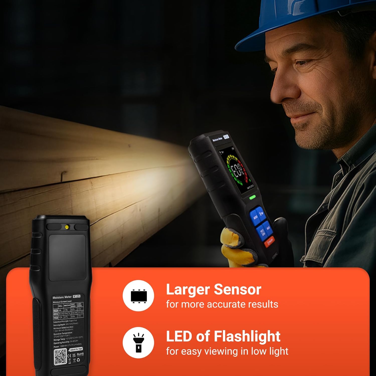 - DESIGNED FOR VERSATILITY & CONVENIENCE: Effortlessly switch between modes to test walls, masonry, hardwood, and softwood with this multi-functional moisture meter. Whether you're using it as a humidity meter for home maintenance or a firewood moisture meter for camping, this pinless moisture meter delivers precision and reliability every time.